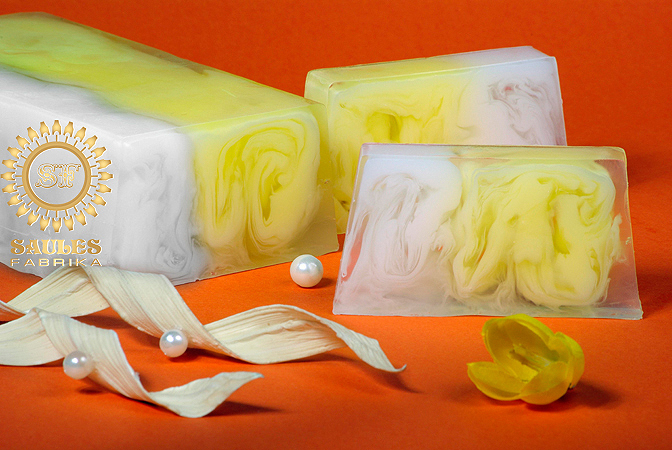 Saules Fabrikan palasaippuatanko, joka on sekä herkullisen näköinen että tuoksuinen. Tästä voit leikata asiakkaalle juuri sopivan palan. Itse paloiteltavat tankosaippuat sopivat hyvin myymälöiden lisäksi myös torikauppaan sekä festari- ja messumyyntiin.